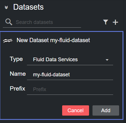 Create a new dataset of type Fluid Data Services, specifying a name and (optionally) a prefix to use to identify the dataset and its values, respectively: