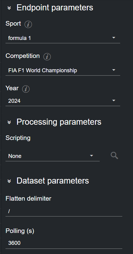 Once an endpoint is added to a dataset, you can select the endpoint card in the Dataset configuration panel. You can now edit the endpoint configuration (for example, Sport, Competition and Year shown in the picture below) in the Endpoint parameters panel on the right.