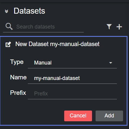 Create a new dataset of type Manual, specifying a name and (optionally) a prefix to use to identify the dataset and its values, respectively: