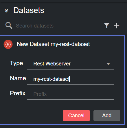 Create a new dataset of type Rest Webserver, specifying a name and (optionally) a prefix to use to identify the dataset and its values, respectively: