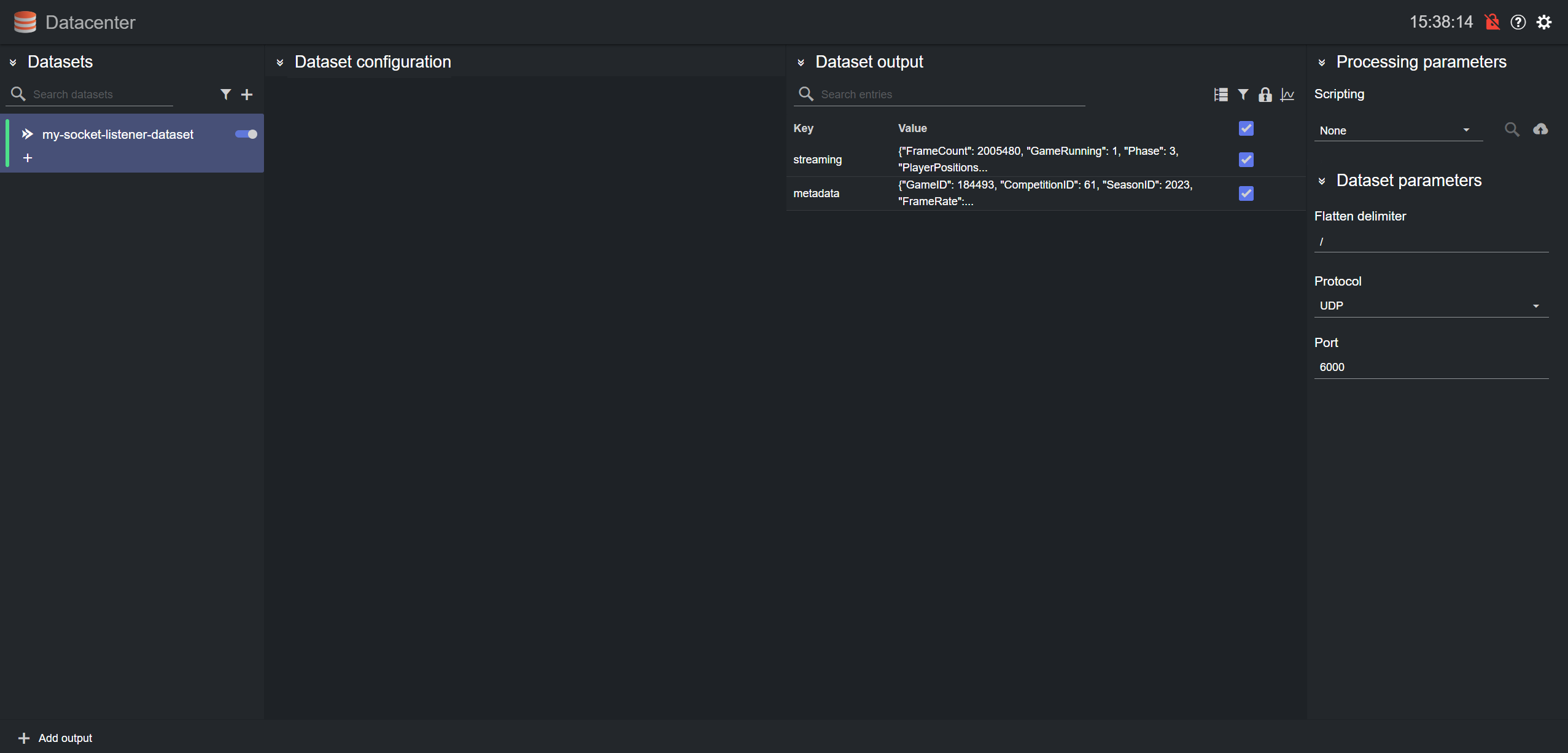 Datacenter supports datasets of type Socket Listener, allowing user to stream data into Datacenter via UDP or TCP. This provider effectively create a server that listens for incoming data.
