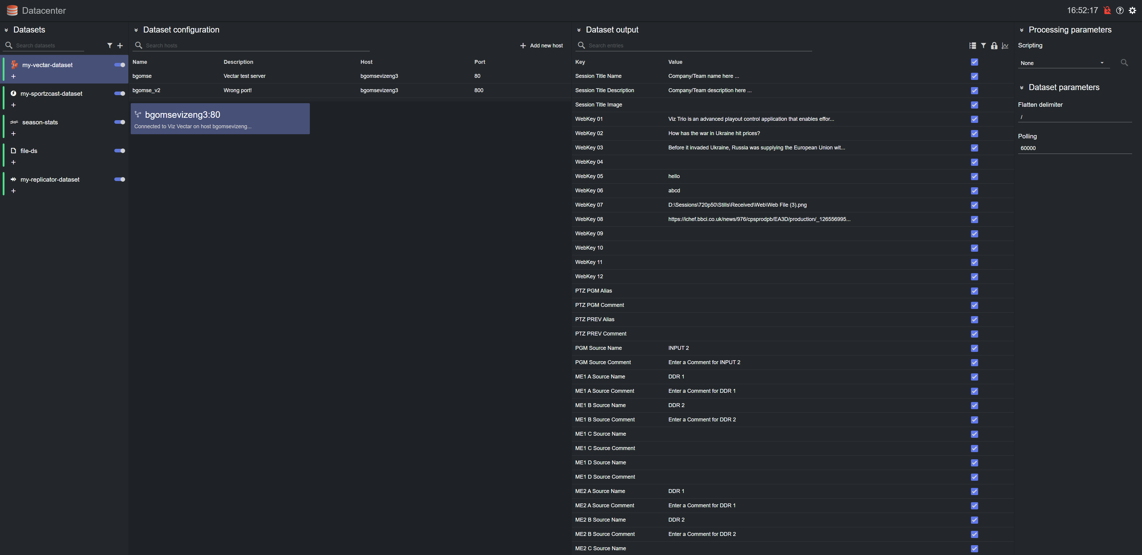 After adding a host machine and establishing a successful connection to it, the data from the TriCaster Vectar system is added to the Dataset output table.