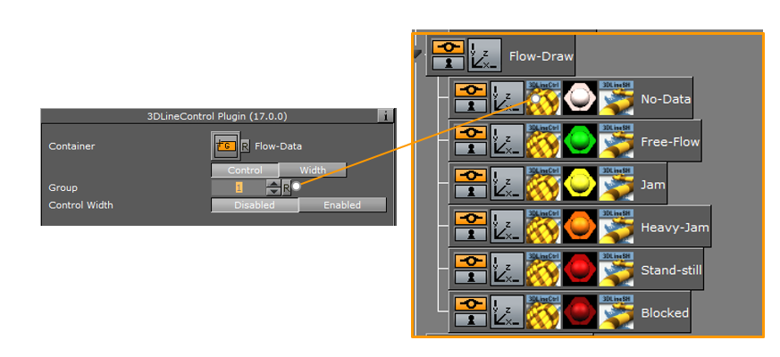 Flow - Data: The 3DLine Tracer plug-in and the VWBReader are added to the container. Underneath it adds three containers with three types of Roads: Low, Medium and High.