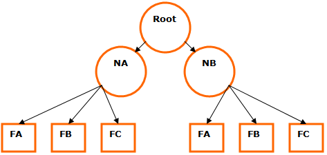 The following example shows a hierarchy with a root, two nodes (NA and NB) and six DataFields. As can be seen each of the DataFields reside below a node. Setting the value of the DataField FA under the node NA follows the hierarchical structure to the required DataField: NA/FA=<some information>;