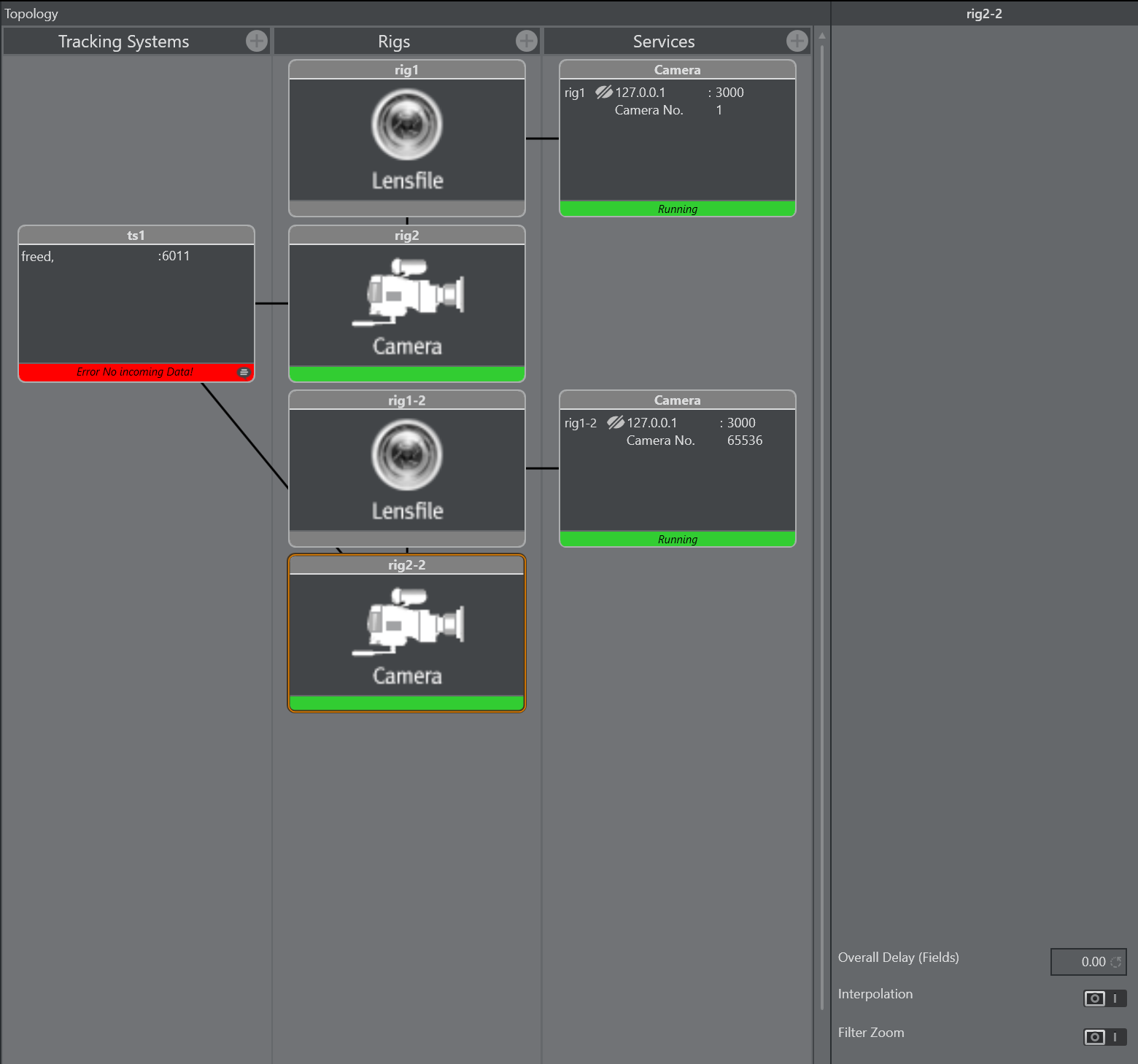 Both camera rigs contain a field Overall Delay (Fields). This allows to specify different delays for sending the camera tracking data to Viz Engine and Reality Connect. Follow the instructions in Delay Configuration to configure the optimal delays.