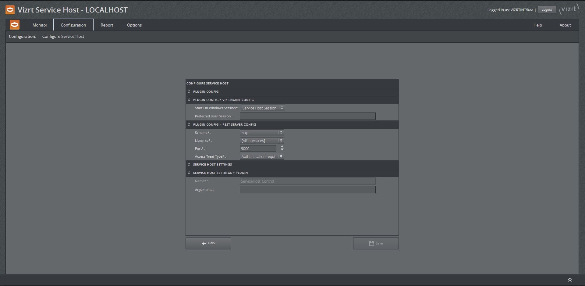 The REST listening address can be configured. By default, Service Host is listening to all interfaces. This is specified by [All interfaces] in the field. For a port number, any valid and unused port number may be used. Later versions may support automatically finding of an available port number.