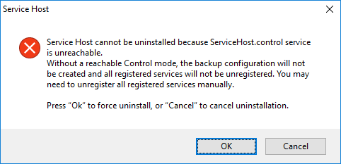 If the Control Mode is unreachable during uninstallation, it is still possible to uninstall. The dialog informs users that the Control Mode is unreachable and prompt users to decide to force uninstall, or cancel. If users force uninstall, users have to manually unregister all Service Host services registered as Windows services.