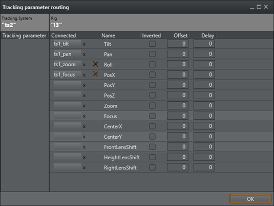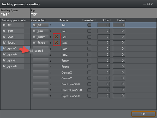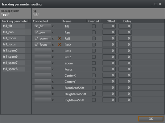 - If a Tracking System parameter does not equal a Viz Engine parameter, a Viz Engine parameter can be modified to adapt to the Tracking System parameter. Click on a Viz Engine parameter and drag to its new position, as required. If a red cross shows, after a parameter has been modified, it means that the connection is still valid, but the connection is now a cross-over connection and not a straight one.