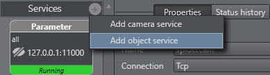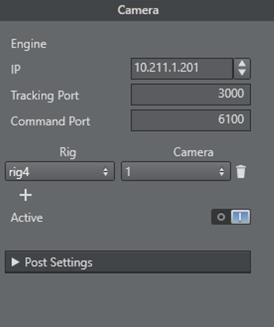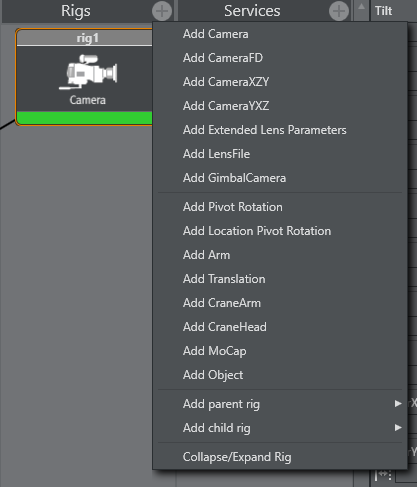 - Configure the service in the Properties panel. When the service is added, one rig and one camera field are available. Pressing the + button add a rig/camera combination. It is possible to send any number of rigs to one Engine. - Rig: Type the name of the rig whose data should send to an Engine.