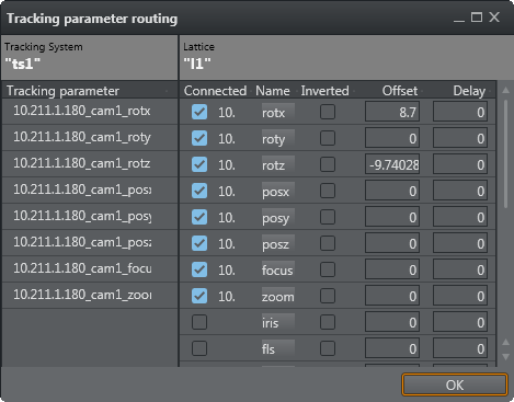 - Check all connectors until the required connections show in the Tracking Parameters panel.