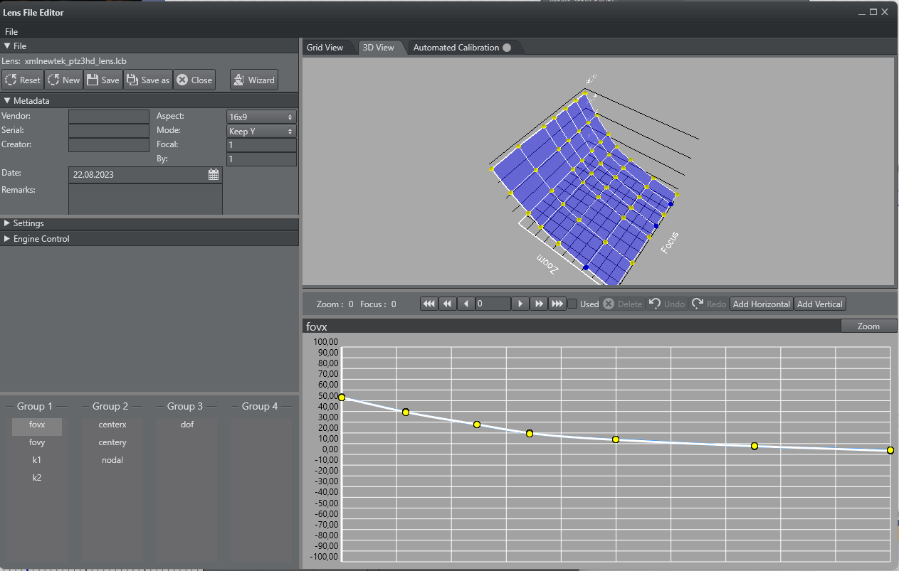 All fields should be filled with care, especially the Focal Length and Focal Multiplier fields. In case of new lens, the Lens File Editor calculates base FoV values out of this information. The dialog only accepts float numbers in the Focal Length and Focal Multiplier fields. The Aspect mode defines if the lens are used as 16x9 of 4x3.