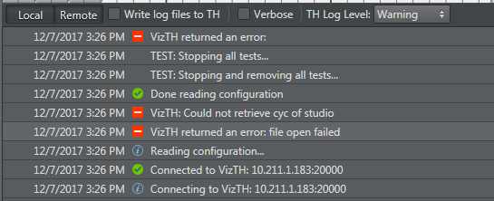 - Write Log File on VizTH: Makes the Tracking Hub write a time-stamped log-file for all tracking data received and sent to Viz Engine when selected. Additional Timing information is logged as well. The log-files are: - VizTH_rcv1.txt