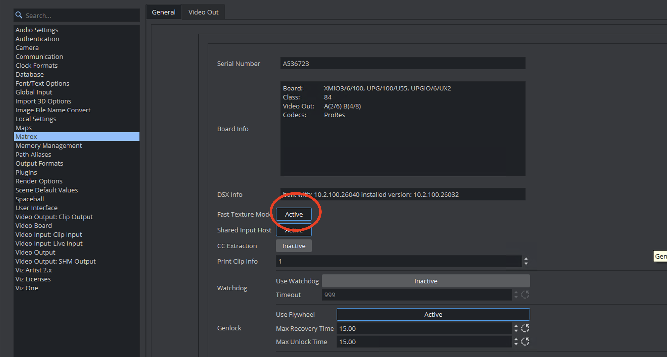 After these first steps close Viz and open the config file. Please make sure, that in the section "MATROX_CONFIG" Matrox.FastTextureMode is set to 1 and that Matrox.InputHost is set to 1.