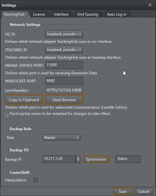 Usually, the tracking network is separated from the Engine network. This makes sense when Tracking Systems need their own IP range, and when the amount of tracking data should not interfere with regular network traffic. Tracking Hub can be set to a Viz adapter, which communicates with the Engines, and a tracking adapter which communicates with the tracking system. On the first startup of the Tracking Hub, the local loop back adapter is selected. Changing the network settings is mandatory after the first installation on a new machine.
