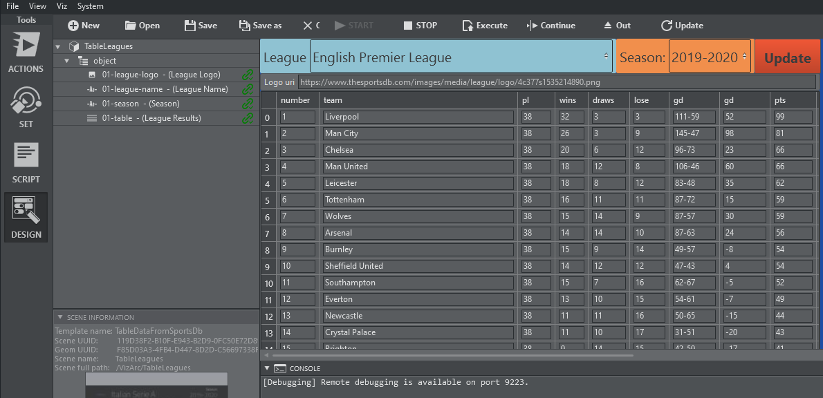 9222for the global script and port9223for the template builder script). Confirm by clicking the Done button.Open a template in Viz Arc's template builder and start it.