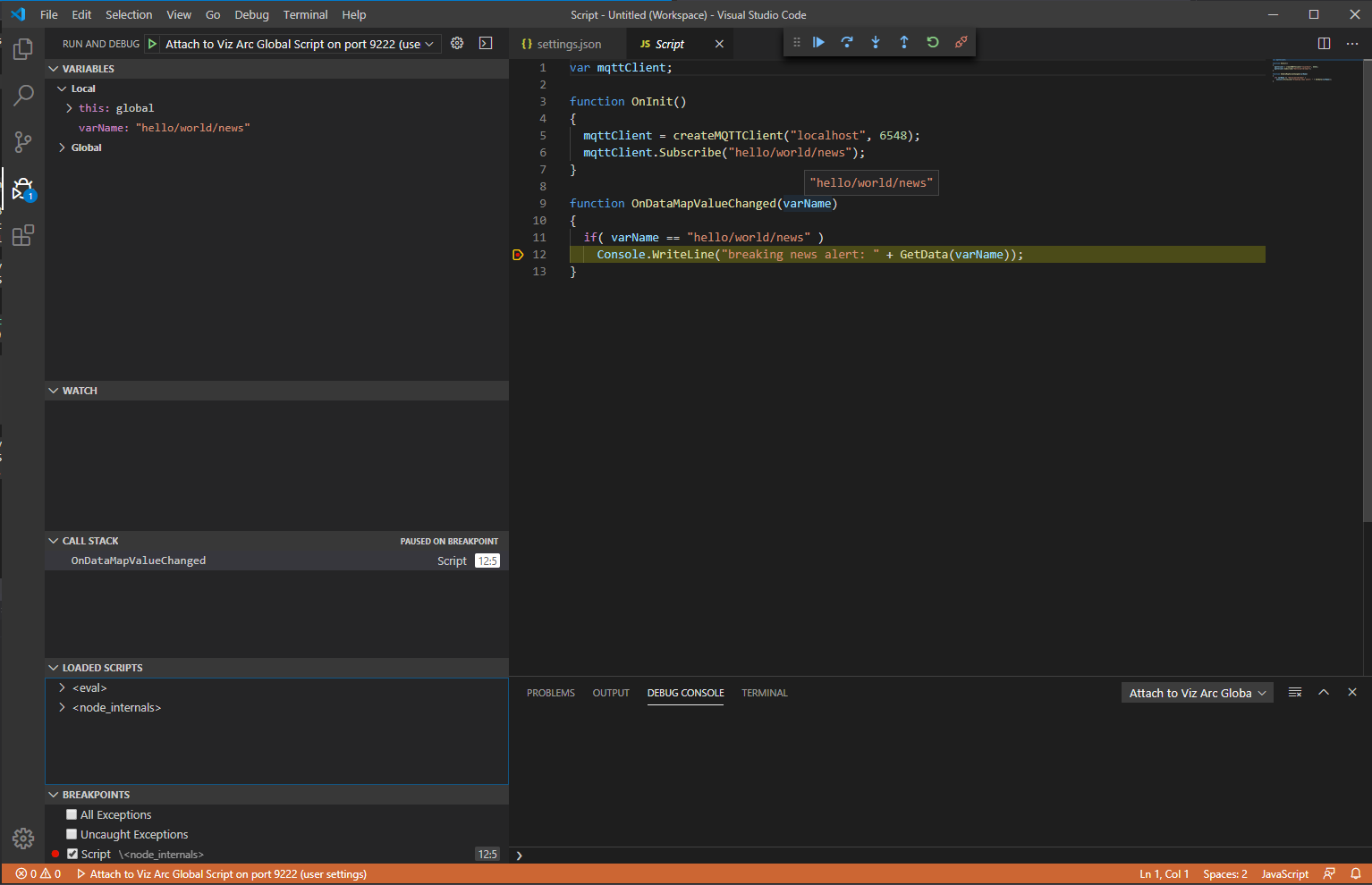 {"debug.javascript.usePreview":false,"launch": {"version":"1.2.0","configurations": [{"name":"Attach to Viz Arc Global Script on port 9222","type":"node","request":"attach","protocol":"inspector","address":"localhost","port":9222},{"name":"Attach to Viz Arc Template Scrip on port 9223","type":"node","request":"attach","protocol":"inspector","address":"localhost","port":9223}]}}You can specify additional configurations for different hosts, port numbers, and other options. See Node.js debugging in VS Code for more information.