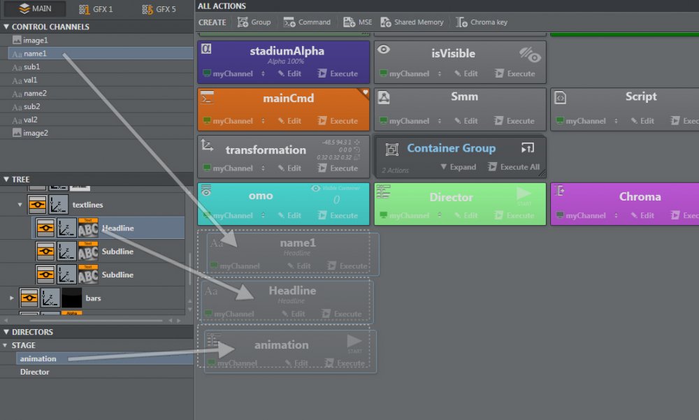 1. Drag and drop any of the supported properties from either the Control ChannelsScene Tree or Directors section in the scene panel to the actions canvas.