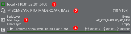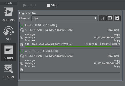 Clip Status: Shows a list currently active clip channels of Viz Engine and it's respective playback status including total time, current position and time to the end of the clip.