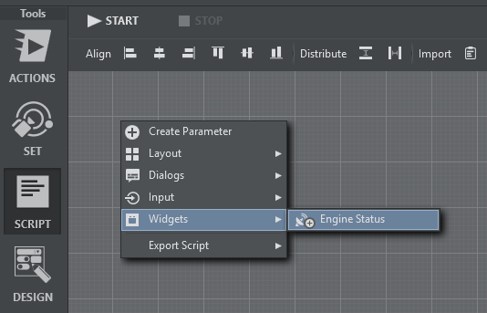Go to the main script (or any template script), right click on the UI editor and select Widgets > Engine Status: