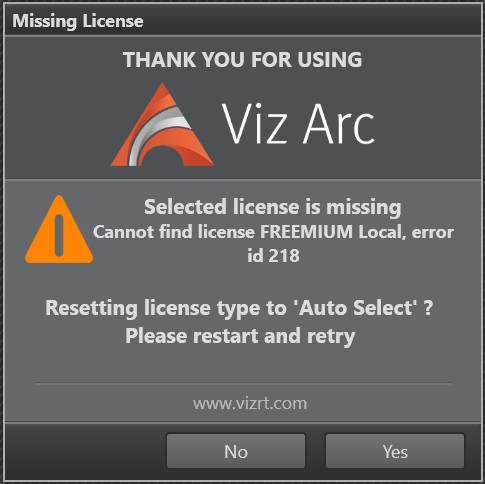 Select Yes to reset the license type to Auto, then start Viz Arc again. When the application starts you can try again to select a specific license.