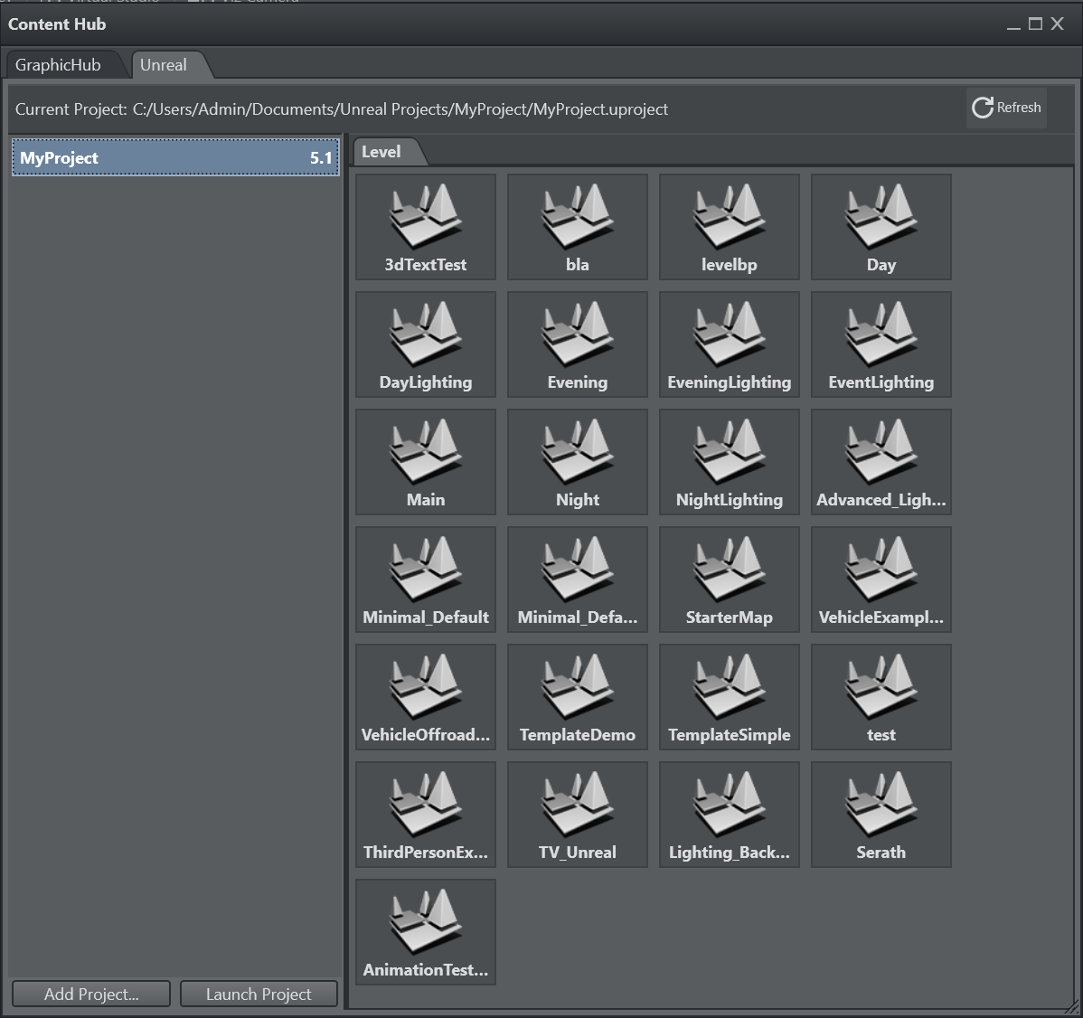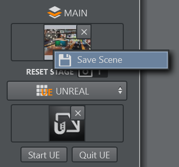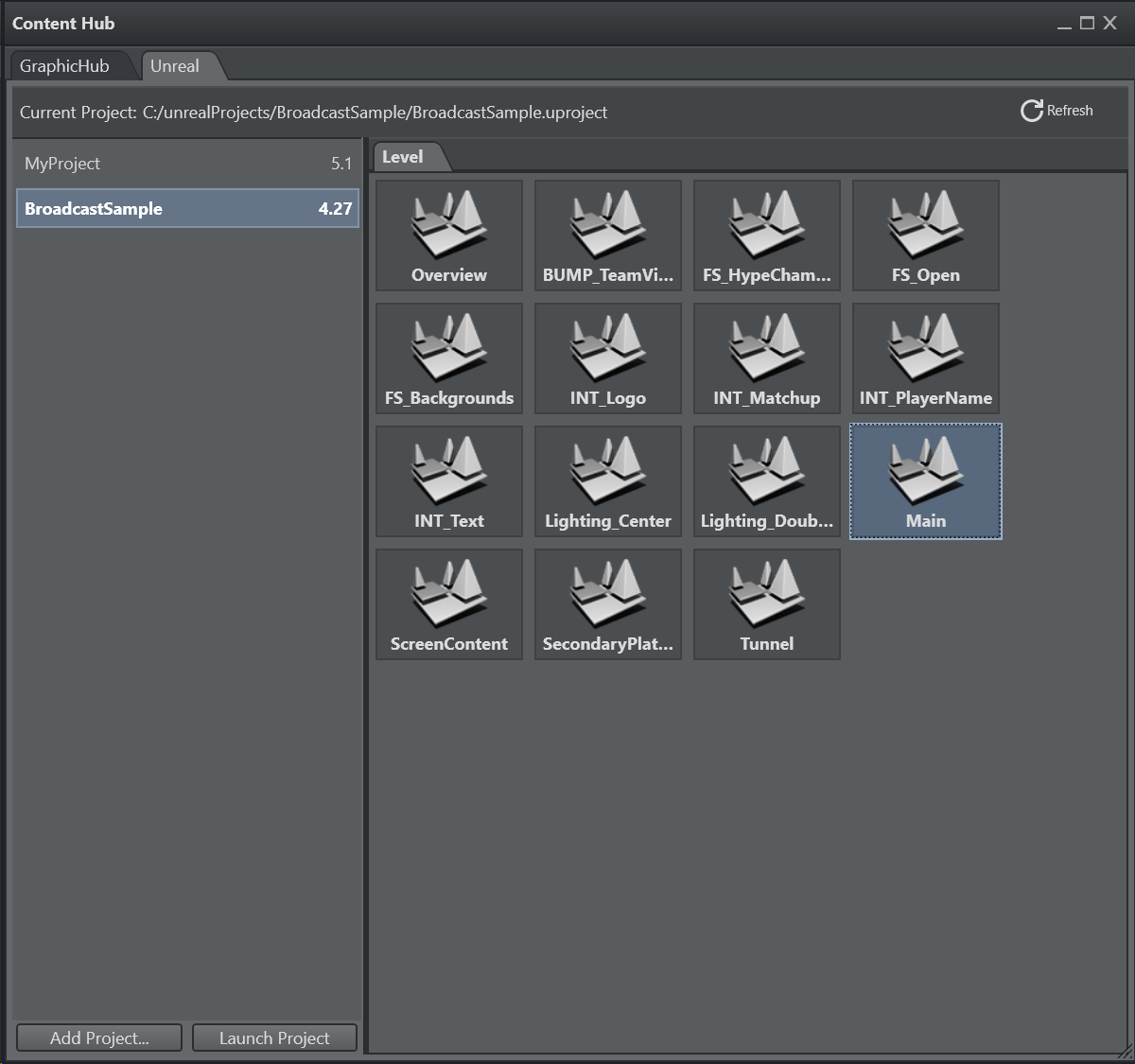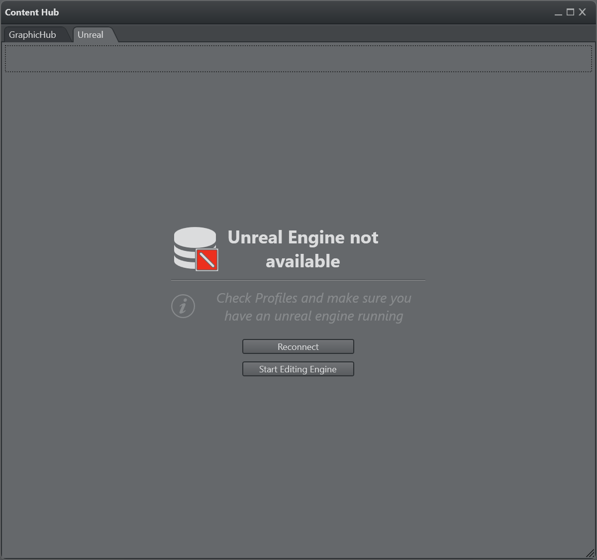 From the drop down menu select the UNREAL item and select a File Collection browsing the Graphic Hub. When changing the File Collection, make sure to close the Unreal Engine using the Quit UE button, start the new File Collection using the Start UE button.