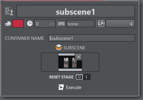 The scene loader can be used to load different scenes in the subscene, clear the scene and reset the subscene director's on load. Under CONTAINER NAME the container path of the subscene can be changed manually.