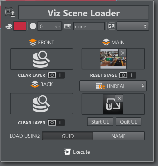 The Scene Loader lets you configure whether to load a scene in the FRONT_LAYER, MAIN_LAYER, BACK_LAYER and in one of the MATTE or GFX channels (from 1 to 16) at the same time. It's also possible to select the RESET STAGE option to load a scene initialized in frame 0.0 on stage. To remove a single scene, press the X icon at the top-right of the selected scene. Select CLEAR LAYER if you want to explicitly clear a specific layer. Select whether to load the scenes using the GUID or the NAME.
