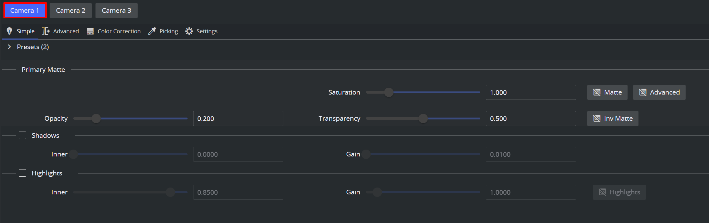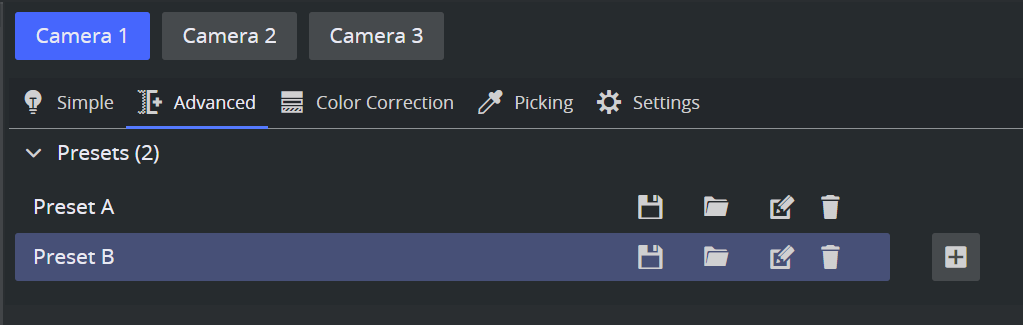 The presets can be recalled, stored, deleted and created like in the classic User Interface. The presets are available in the SimpleAdvanced and Color Correction views.