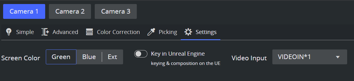 • Screen Color: Whether to key on a green or bleu screen or whether the keying should take place externally.