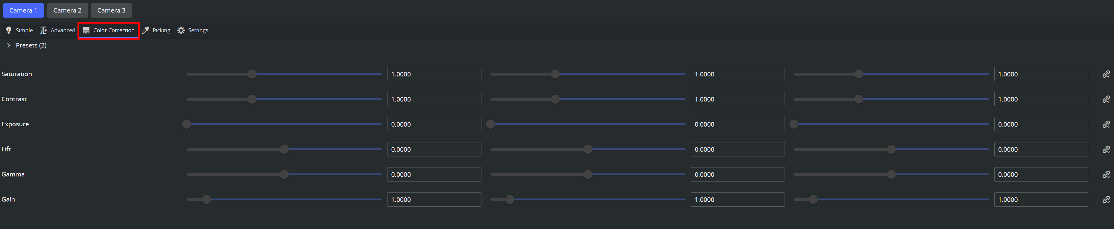 The Color Correction view displays the the color correction values with additional sliders.