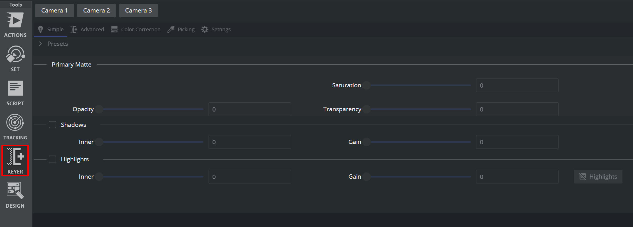 Once at least one Precision Keyer Action has been created on the action canvas, the left hand tool bar displays a KEYER button which holds a dedicated UI for Keyer actions.
