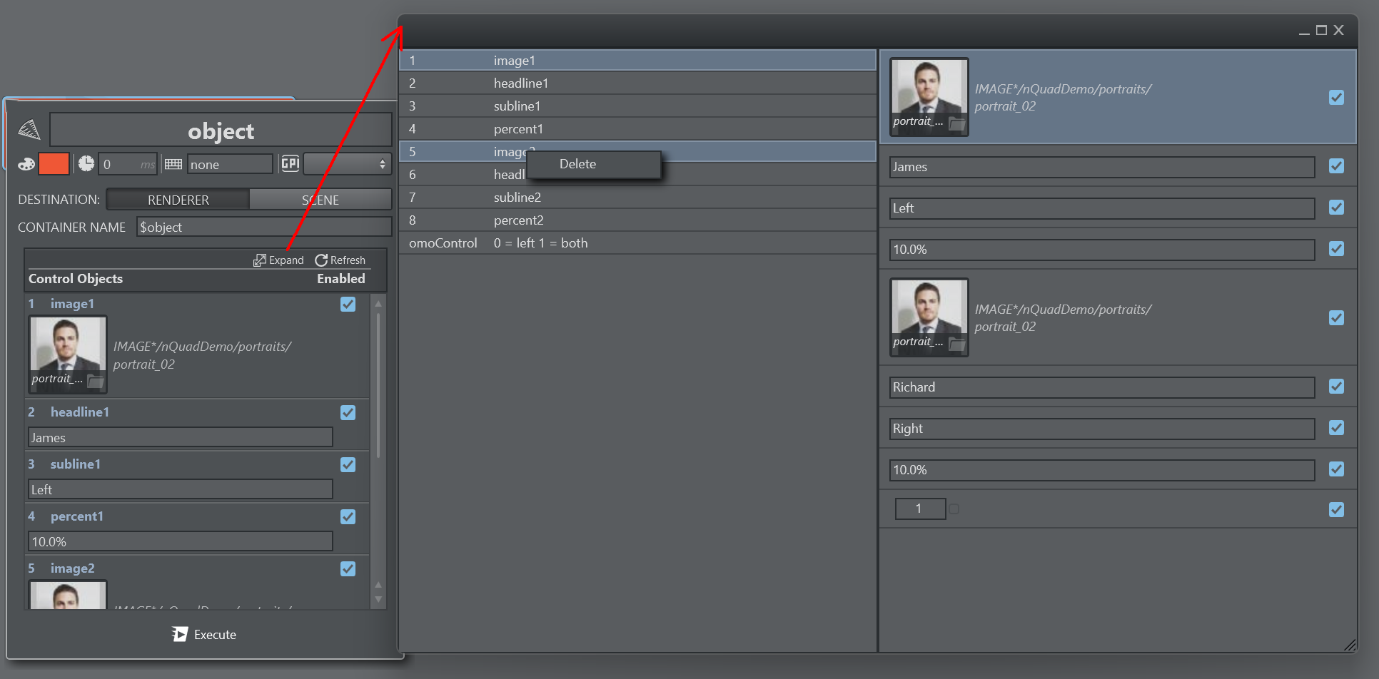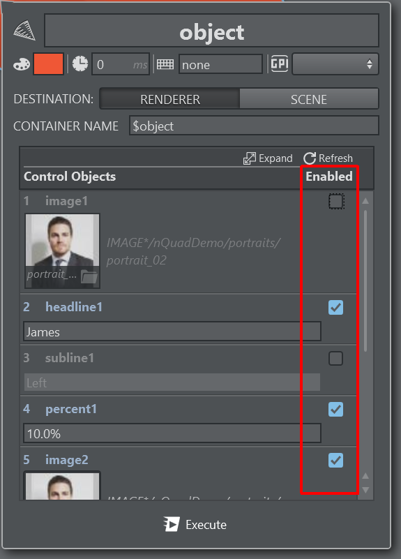 In some cases you might want to send only a subset of the entire Payload. Use the Enabled toggle flag for each Control Object to enable or disable setting the specific property on the Viz Engine. It behaves similar to the delete option described above, but in this case you can re-enable the disabled Control Object easily.