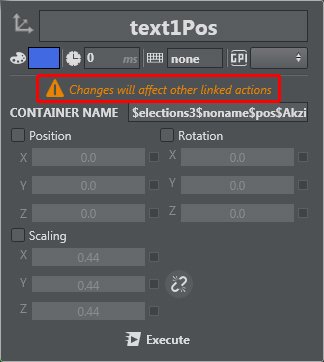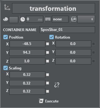 Transformation lets you set position, rotation and scaling of the selected container. You can also scale in proportion by clicking the Lock icon next to the scaling panel. Position, Rotation and Scaling can be disabled using the check boxes. When disabled, those parts are not being sent to the Engine on execution. For example, when selecting Rotation only, only the rotation of the target container is affected on execution.