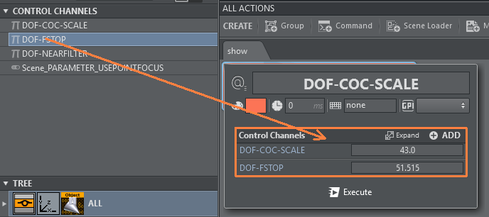 Control Object actions can be used by dragging a Control Object plug-in from the scene tree into the action canvas. It gives you a list of the Control Objects under the respective tree structure.