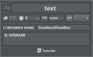 This menu lets you set text in the selected container. The action supports standard text geometry as well as Text introduced in Viz Engine 4.3.