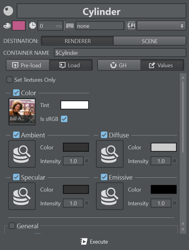 Analog to the PBR Material, the action can be executed in two modes: Pre-Load or Load. Pre-Load preloads all the images present in the action on the Engine. Load effectively loads the Phong Material onto Viz Engine. Typically, you group all Pre-Load actions and execute them on Initialization, then trigger only the Load actions. Right clicking the action execute button always sends Pre-Load commands.