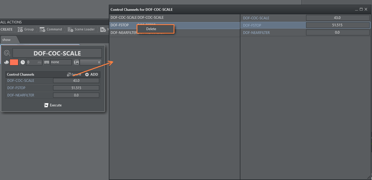 To remove Control Channels from the action, click the Expand button and use the context menu to delete single Control Channels in the newly opened window: