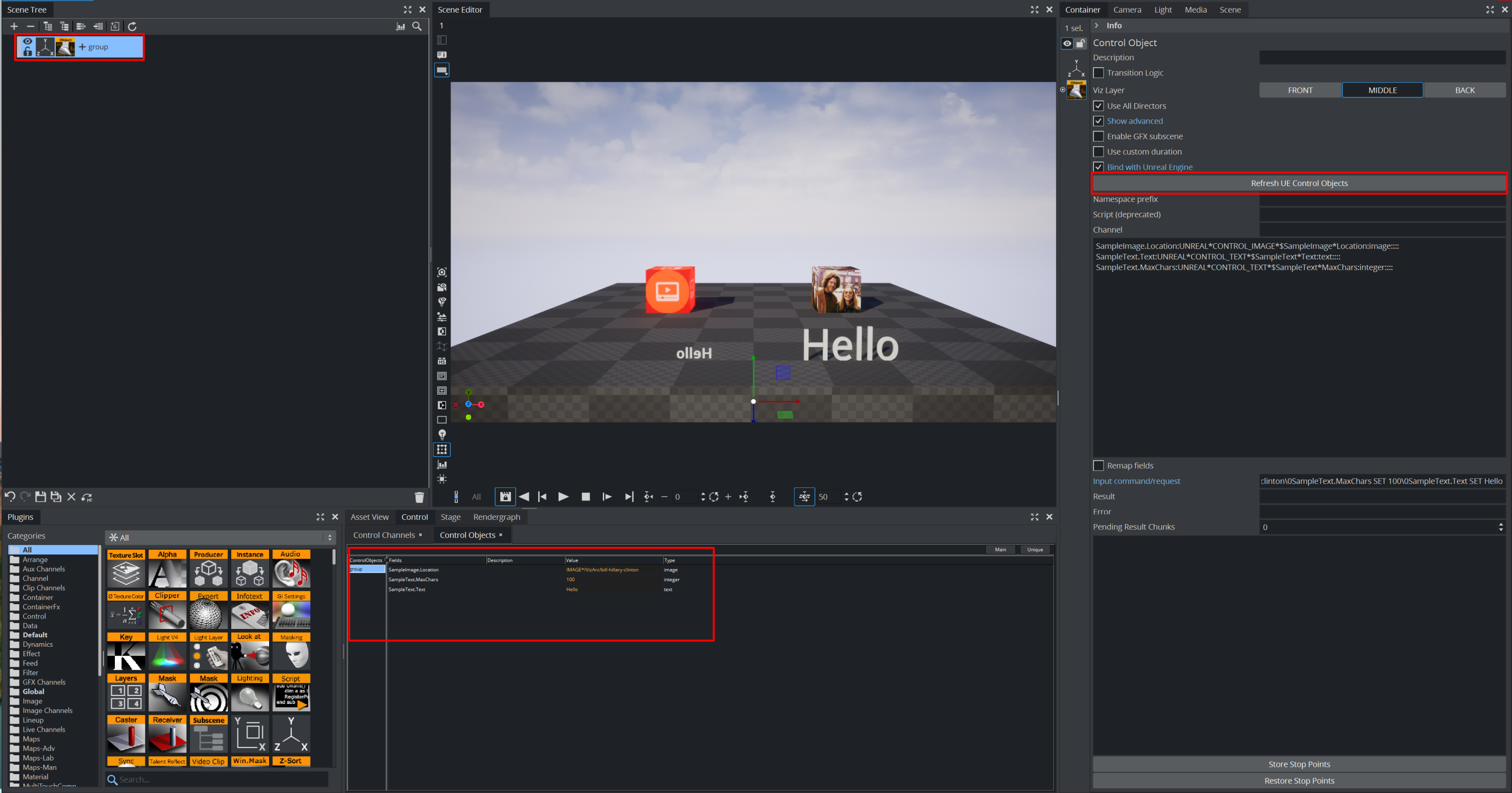 The Viz Engine's Control Object integration allows you to control aspects of the Unreal scene using Control Objects. Viz Engine's Control Objects can be used to ingest images from the Graphic Hub to the Unreal Engine.