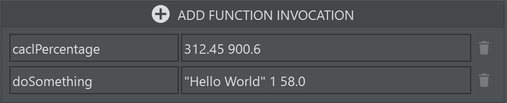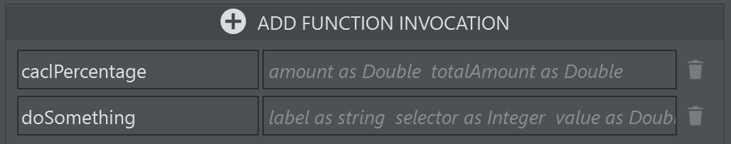After adding the functions you whish to invoke, enter the parameters where necessary. A hint in the parameter's text box in the parameter gives you the signature of the function.