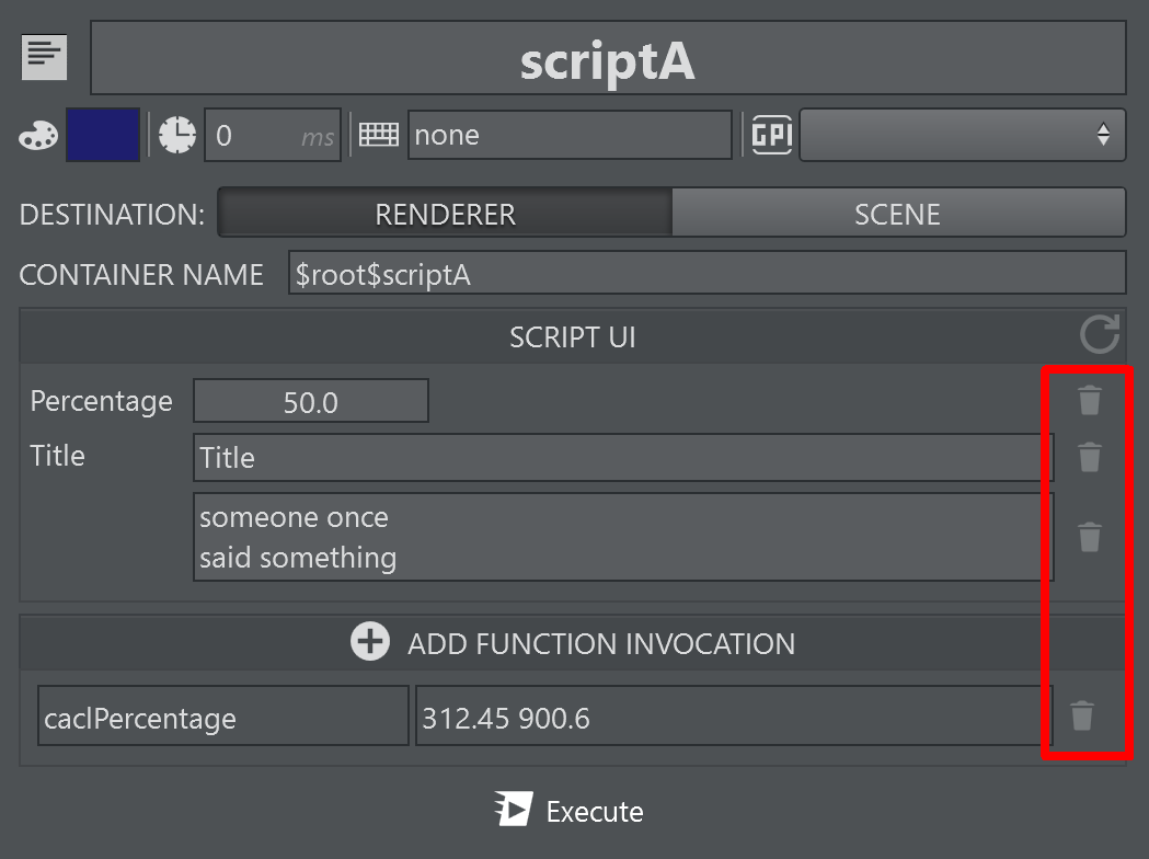 Use the small trash icons on the right hand side of each row to remove parameters that you don't want to send to the Viz Engine. Press the refresh icon to reload the script from the Viz Engine's scene. Make sure the scene is loaded on the Editing Engine.
