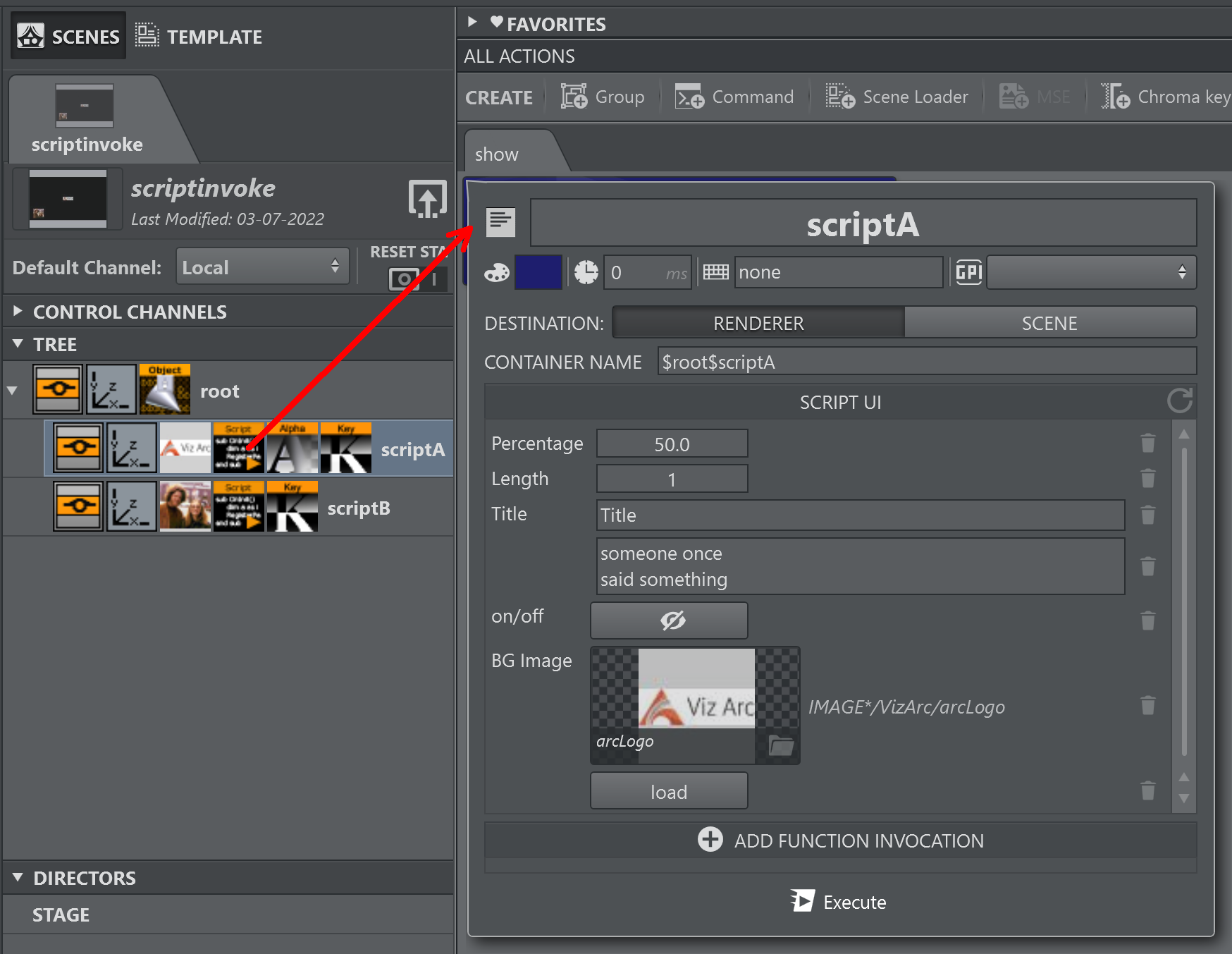 On execution of the Script Action, all UI parameter values and function invocations listed in the action are sent to the selected channel's Viz Engine(s).