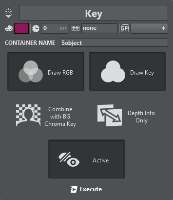 Active - shows if the Key plugin is active or inactive. Typically used in a green screen scenario to determine whether an object should appear in front of or behind the talent. |