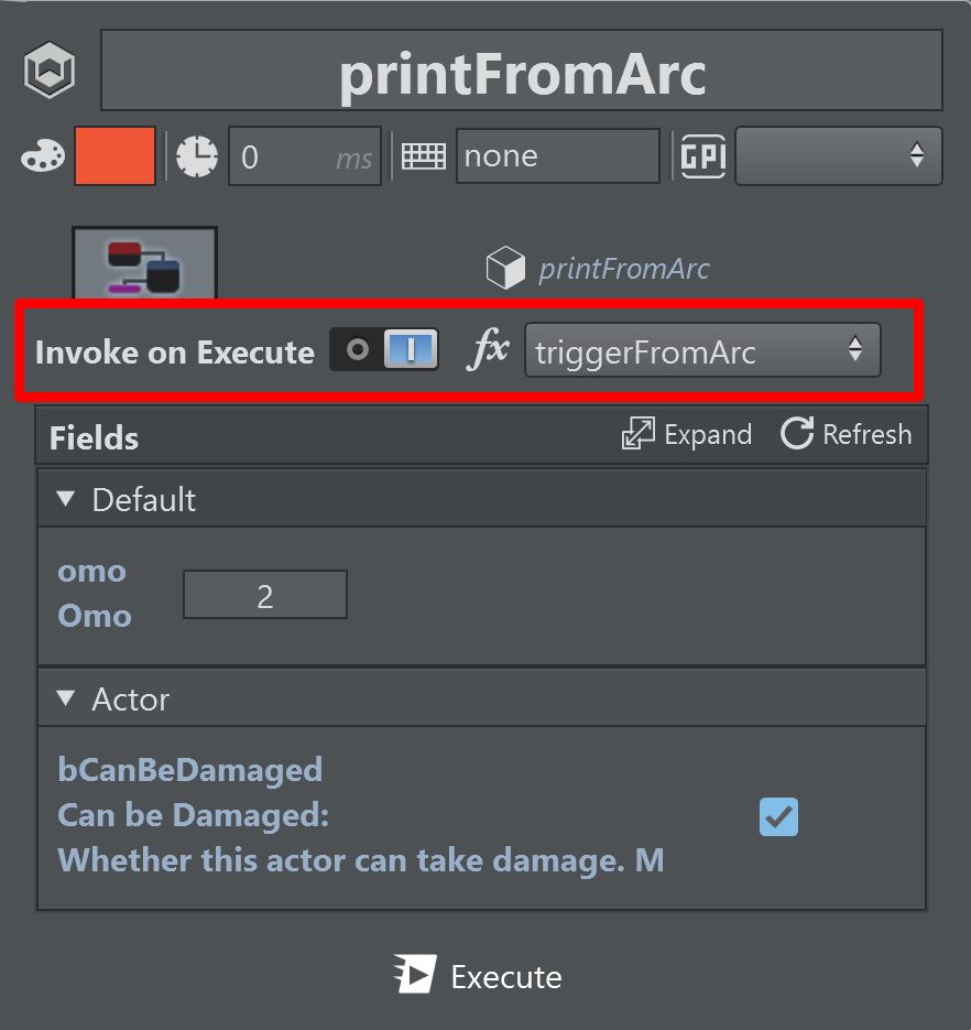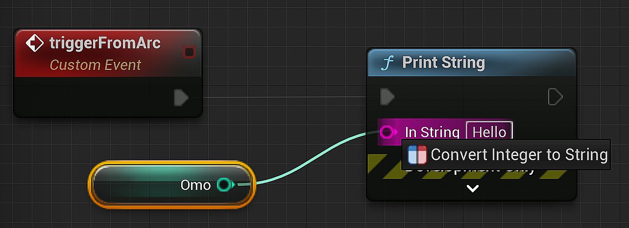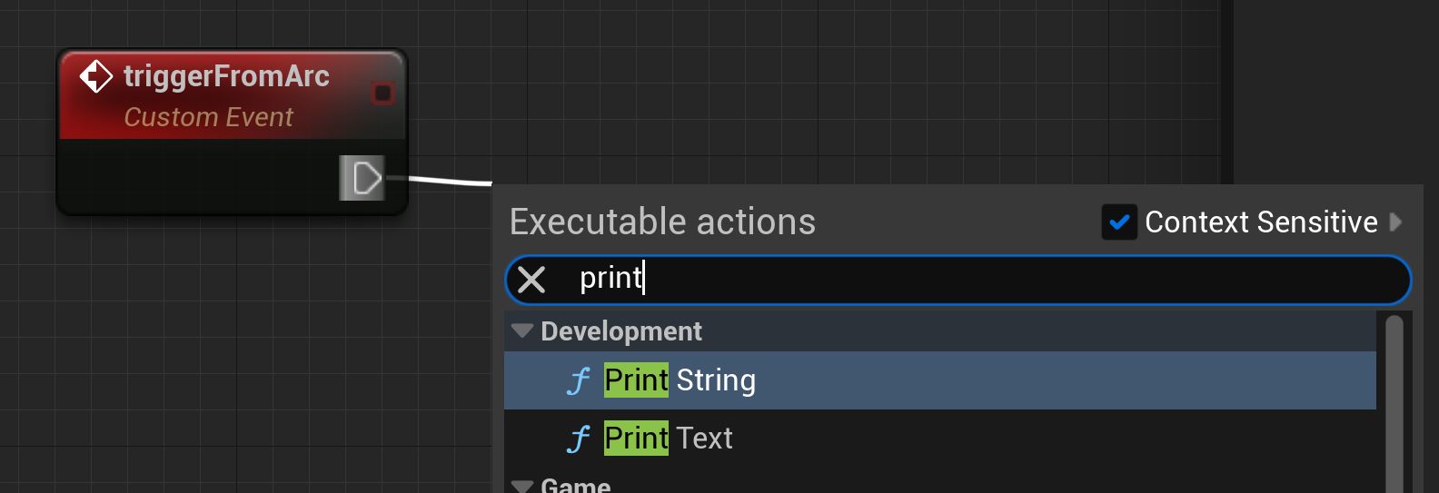 Rename the event to triggerFromArc and connect the Exec node to a Print String node.