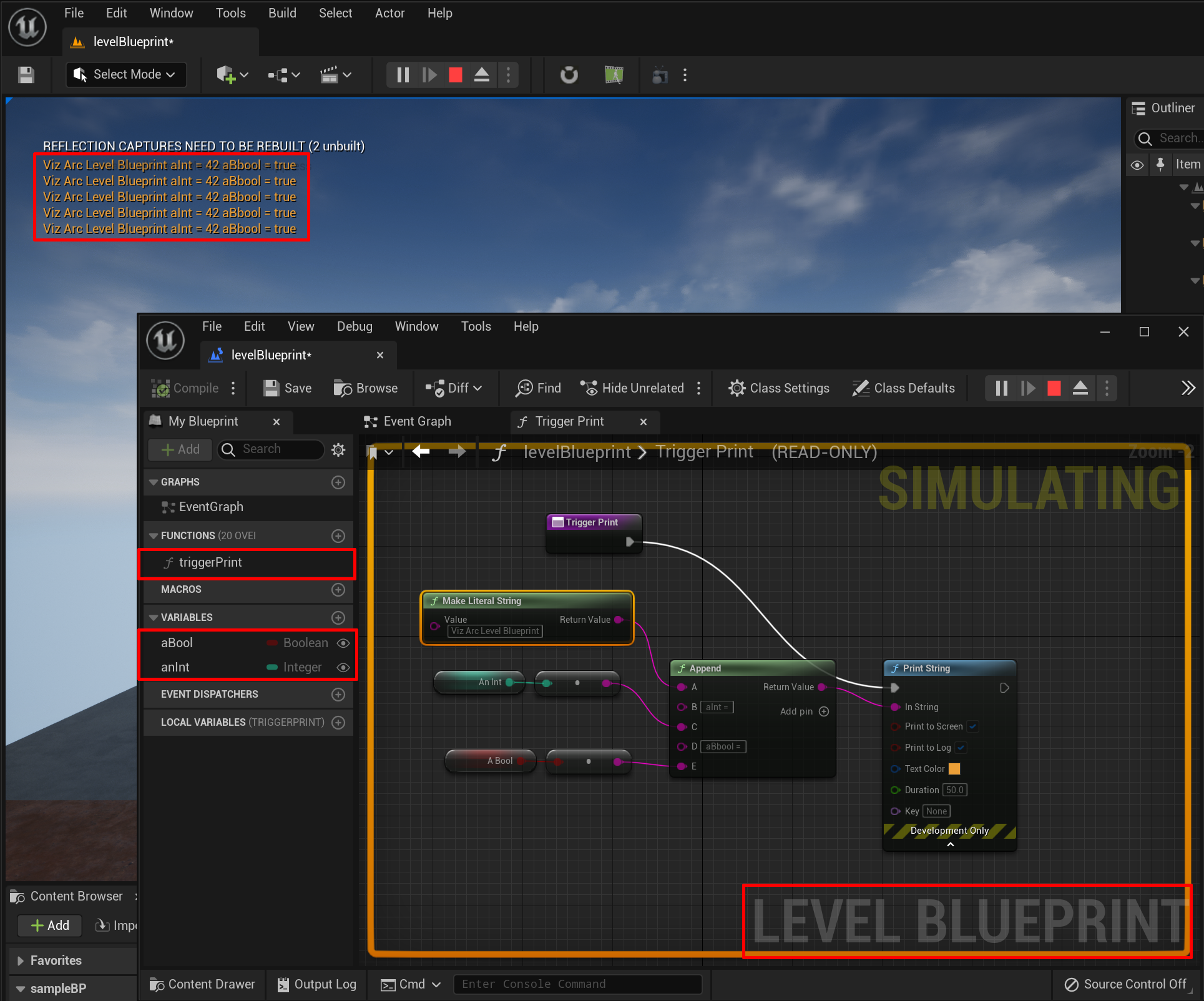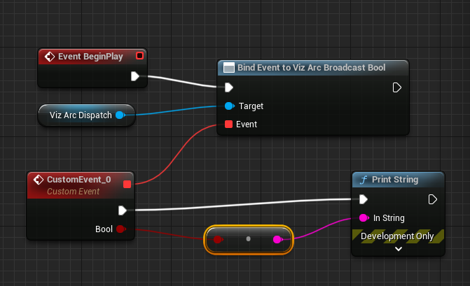 bool. The bool value and event trigger can be used elsewhere in the Blueprint, in this sample just print the bool value on the render output.The last step is to set the Viz Arc Dispatcher Reference. To do this, go back to the editor, select the Blueprint that you were setting up, loop on the details tab for your newly created variable and select the one you want to listen to from the list of Viz Arc Dispatchers.