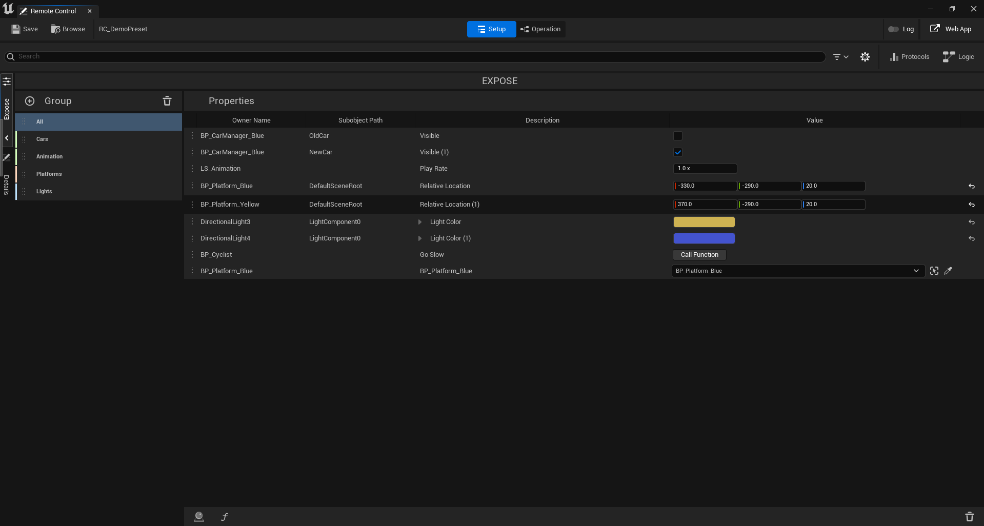 A preset on the Unreal Engine might look like this, exposing transformations of object, light color, a blueprint function or visibility of a mesh.