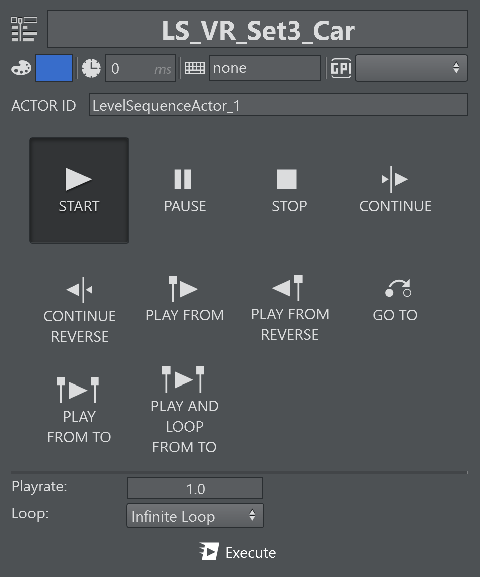 Animation action lets you assign an animation to the selected Unreal actor or browse a custom animation from those available by clicking the Animation icon. Animations can also be played, continued, stopped and/or looped.