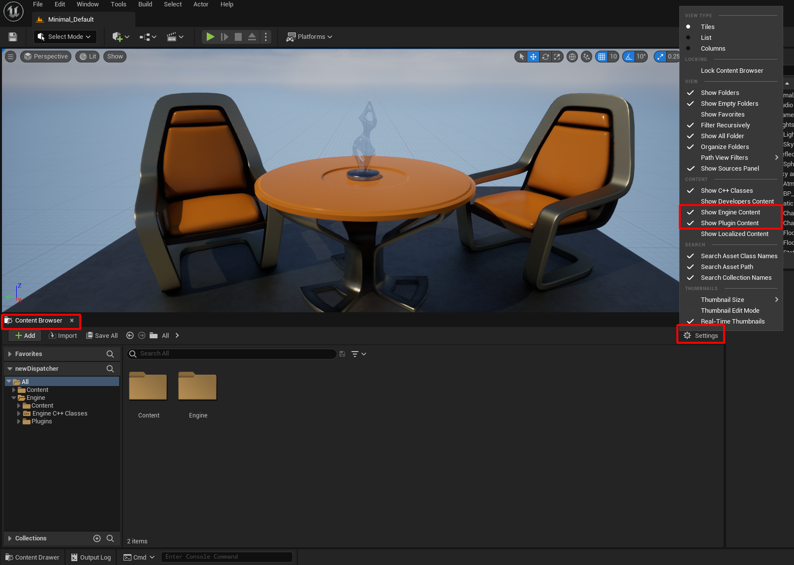 On the content browser, make sure that Show Engine Content and Show Plugin Content are checked (click on the Settings button to open the settings panel).