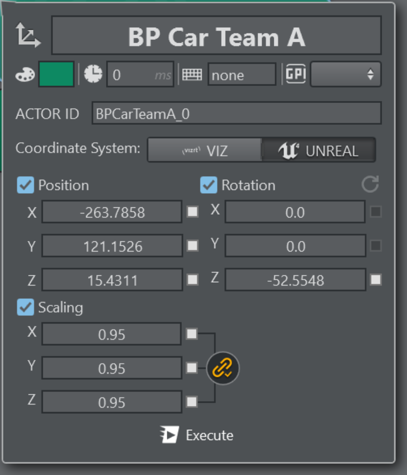 The coordinate system toggles the behavior of the positional XYZ axis, the default UNREAL is a Z-up left-hand system, while VIZ is Y-up right-hand system. It might come handy to use the Vizrt coordinate system when objects needs to be positioned relative to each other in the two engines.