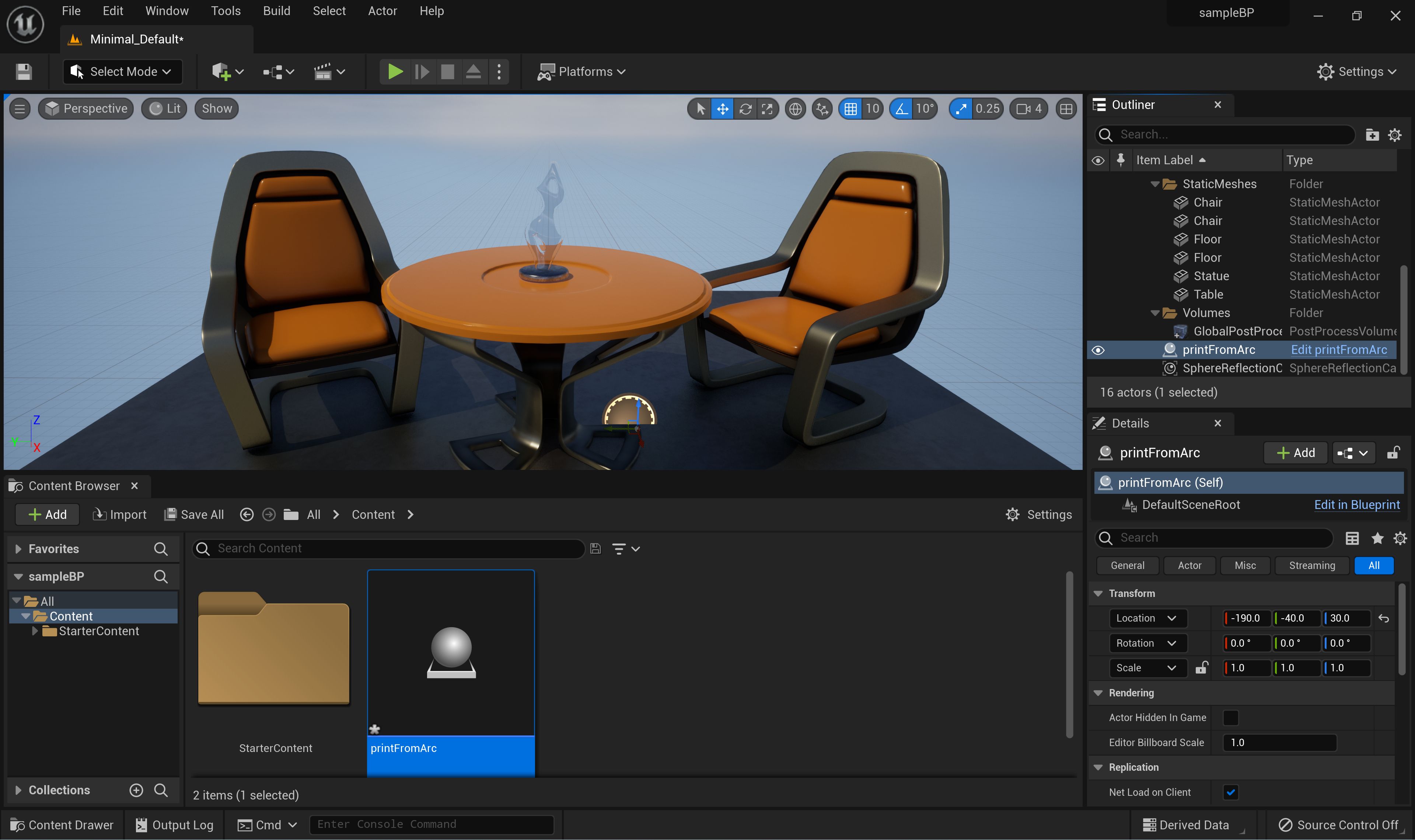 Rename the new Blueprint (for example, printFromArc), then drag and drop it to the render viewport.