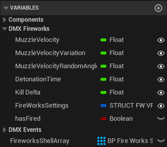 Blueprint action contains a list of visible values (set as public and editable in Unreal). To make these values visible and accessible to Viz Arc, you must activate them in the Blueprint window: